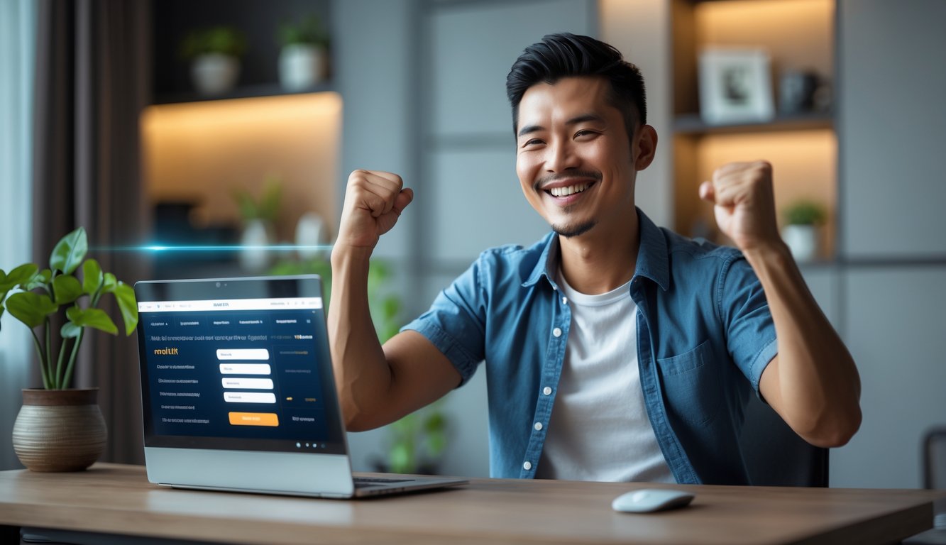 Seorang pria Asia Tenggara tersenyum dan melakukan gerakan kemenangan di depan laptop di dalam ruangan yang nyaman.